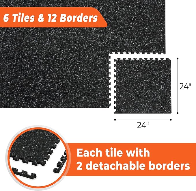 - 【All Places Usable】6 tiles, each with a thickness of 0.4 inch and a size of 24in x 24in, covers 24 Sq Ft. You can place this flooring mat wherever you need it! It's suitable for a garage, gym, family fitness room or playroom.