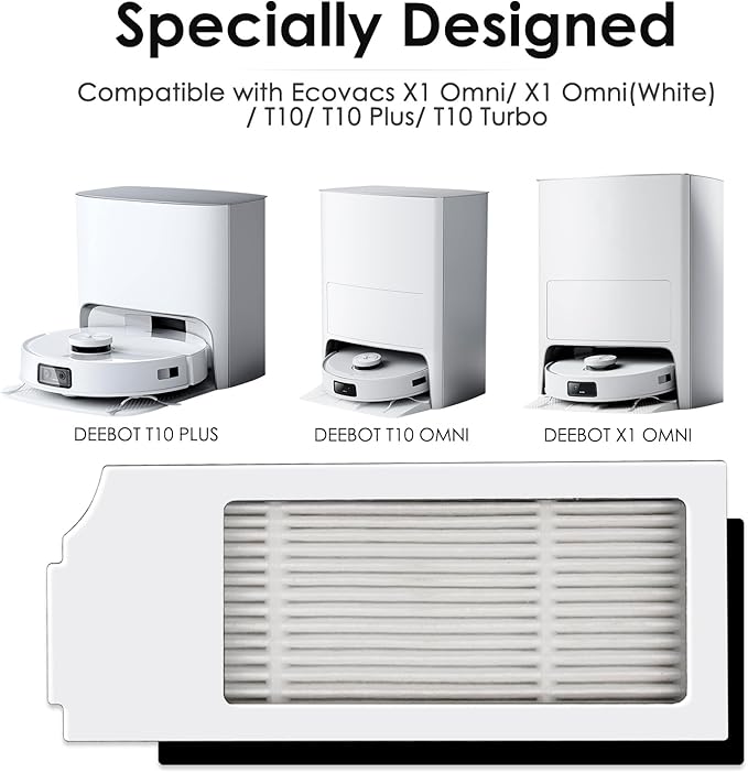 - 【Specially Designed】 The replacement robot vacuum filter parts are specially developed for ECOVACS DEEBOT N20 Plus/ N20 Pro Plus/ X1 Omni/ X1 Omni(White)/ T10/ T10 Plus/ T10 Turbo/ T10 Omni. Please make sure your model is correct before order.
