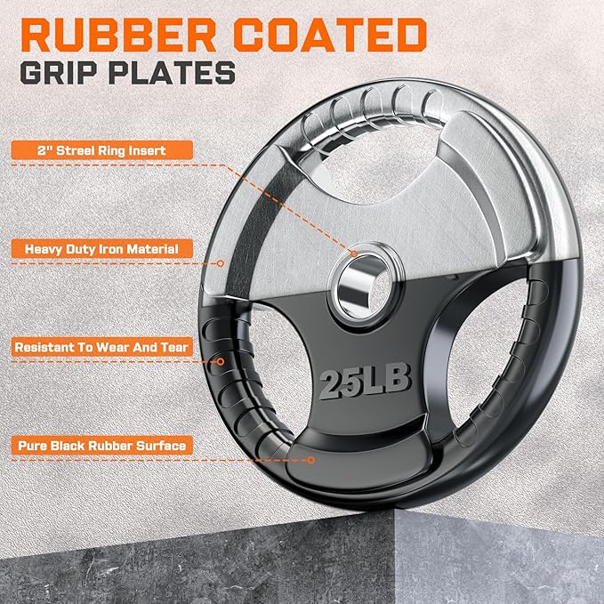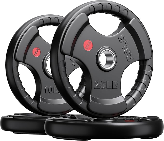 - EASY GRIP – The Olympic weight plates is designed with three holes and there are grooves in the grip holes for easy and safe handling when loading and unloading heavy objects. Descending and lowering after weight training is safer and more practical. The comfortable grip also gives you a good using experience