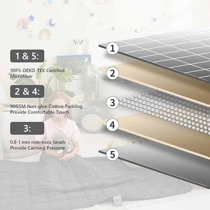 - Premuim Material: The weighted blanket is made of soft breathable microfiber material and filled with 0.8-1 mm non-toxic hypo-allergenic glass beads. This blanket could providing a cooling sensation in the summer and a breathable warmth in the winter