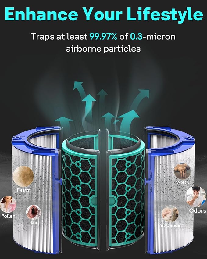 - 【PREMIUM FILTER】: This premium TP04 HP04 DP04 air filter replacement parts feature Dual-Layer Filtra-tion. The high-efficiency filter effectively captures a remarkable 99.97% of particles as small as 0.3 microns. The activated carbon filter efficiently cleans household odors from smoking, pets, and cooking fumes
