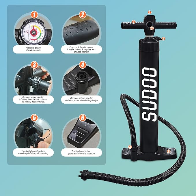 - Package List: 1x SUDOO Inflatable Stand Up Paddle Board, 1x Backpack, 1x Safe Ankle Leash, 1x Adjustable Paddle, 1x Hand Air Pump, 1x Repair Kit. Quick Inflate and Deflate: SUDOO Stand Up Paddle Board within 10 minutes inflate and deflate easily. The upgraded 90-degree rotating Boston high-pressure air valve prevents leakage effectively. When fully inflated, the SUP Paddle Board is very frim and does not banana.