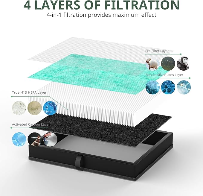 - 4-LAYER FIL-TRATION SYSTEM: Our MK-04 fil-ter compatible with MK-04 air puri-fiers is designed with a 4-in-1 High-Efficiency System. Equipped with Pre-Fil-ter, HEPA Fil-ter, Special Layer for Pet, and Activated Carbon Fil-ter. Block the hairs, pet dander and others, attach to 99.97% of airborne larger than 0.3 microns, and take in unpleasant odors from smoke, cooking odors, and pet odors, and VOCs