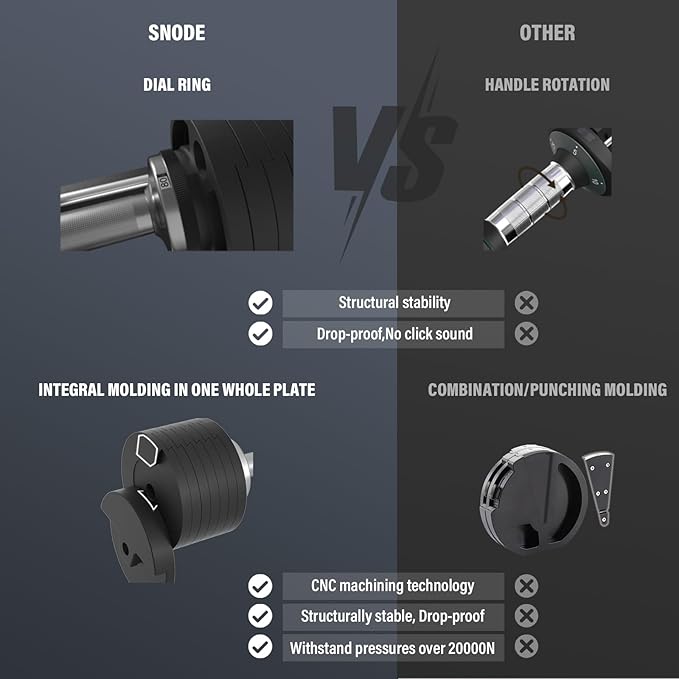 - 【To Our Customers】Please follow the user manual and install the dumbbell plates as order. The brand new product has 1 year FREE replacement parts! Please mail our after sale email if any issue! SNODE makes sure the guarantee for customer service!