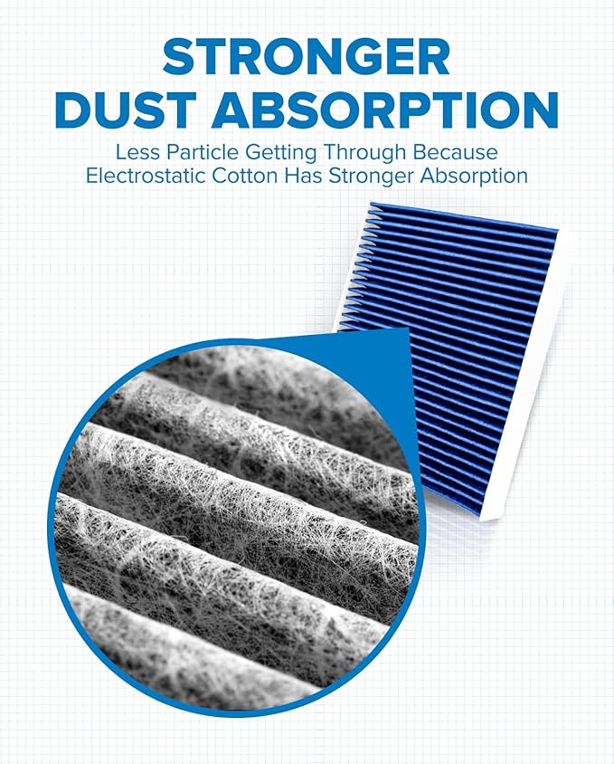 - Filter 99% Dust & Pollen: PHILTOP cabin air filter has long-fiber layer of electrostatic cotton which efficiently traps small particles down to 0.1-0.3 microns and firmly on the surface of the fabric, provides a comfortable interior environment for you and your family.