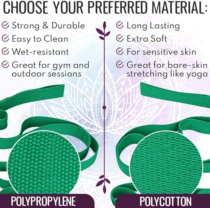 - STRETCHING STRAP. Color: GREEN. Material: POLYCOTTON. Width: 1.5 IN. Length: 79 IN. 10 Loops. Non-elastic. Superior Non-slip Grip.