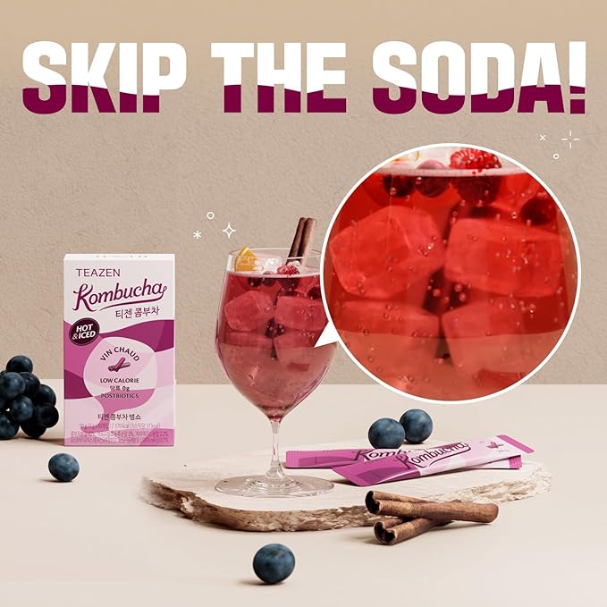- 🍷 MULLED WINE Flavor: Enjoy it hot or iced—just the way you like it! Infused with the cozy flavor of cinnamon and spices, this kombucha is inspired by the classic European winter drink Vin Chaud. With heat-stable postbiotics, it's perfect for mixing into hot water for a soothing tea, or into cold water with ice for a refreshing twist on mulled wine.