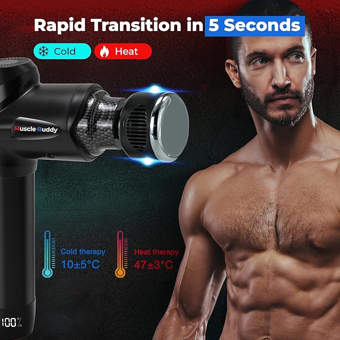 - Heat and Cold Therapy: Massage gun with heat cold relieve muscle tension. Recover faster with the MuscleBuddy Massage Gun's heat and cold therapy. Heat therapy promotes blood circulation, while the Cold Therapy mode helps reduce inflammation and swelling. 1 Heating and Cooling Head & 9 Standard Massage Heads MuscleBuddy Massager Gun Deep Tissue comes with a heating and cooling massage head that can heat up to 107°F (42°C) or cool down to 61 ℉ (16°C) for deeper muscle relaxation and stress relief