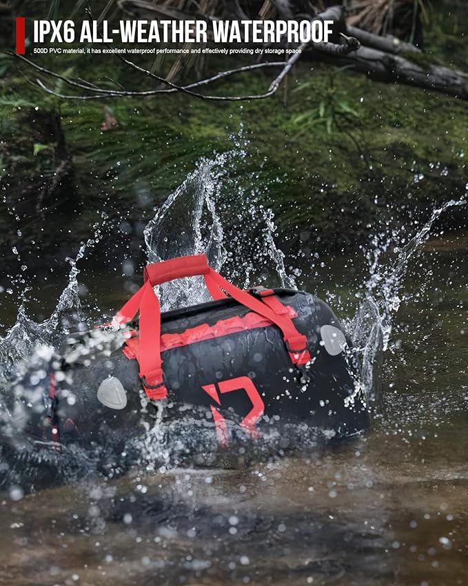 - 【Excellent waterproof property】Made with high-quality 512D PVC material, this bag features seamless sealing welding and a roll-top design that ensures complete protection against heavy rain. The Velcro closure at the top makes it easy to roll up and access your items quickly. This fabric withstands extreme temperatures, humidity, and UV exposure without cracking or deteriorating, making it perfect for long-distance travel. Your belongings will stay dry in any weather.