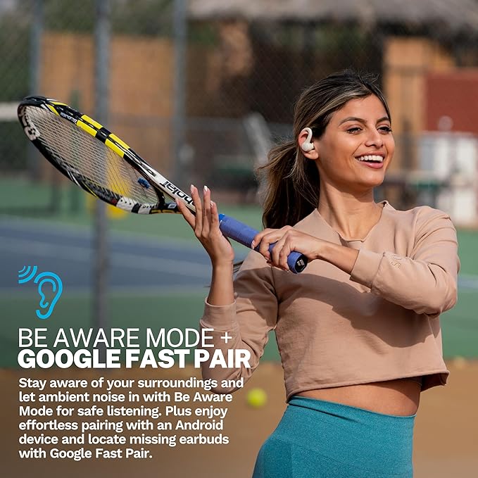 - Be Aware Mode + Google Fast Pair: Stay aware of your surroundings and let ambient noise in with Be Aware Mode for safe listening. Plus enjoy effortless pairing with an Android device and locate missing earbuds with Google Fast Pair