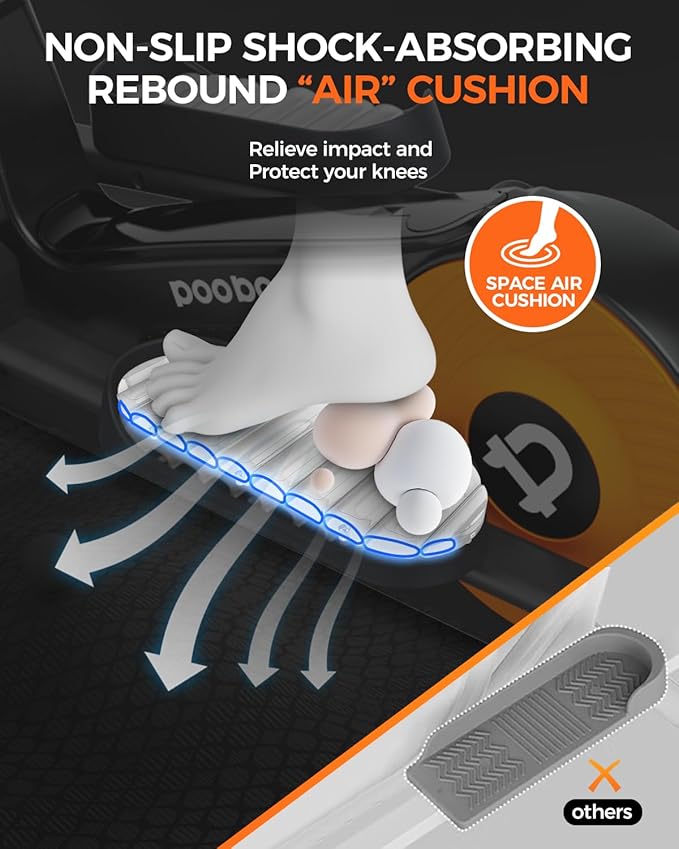 - Hyper Quiet Magnetic Rear Drive System:The pooboo E399 elliptical features a smooth and natural motion provided by a quiet magnetic drive system. The Rear Drive combined the heavy 16 LB flywheel allows the center of gravity to shift back for safer and easier workout. Functions in both forward and reverse motion. Control the sound at 20 DB, your workout will never disturb your neighbors or family, just enjoy a peaceful and effective exercise in your own home