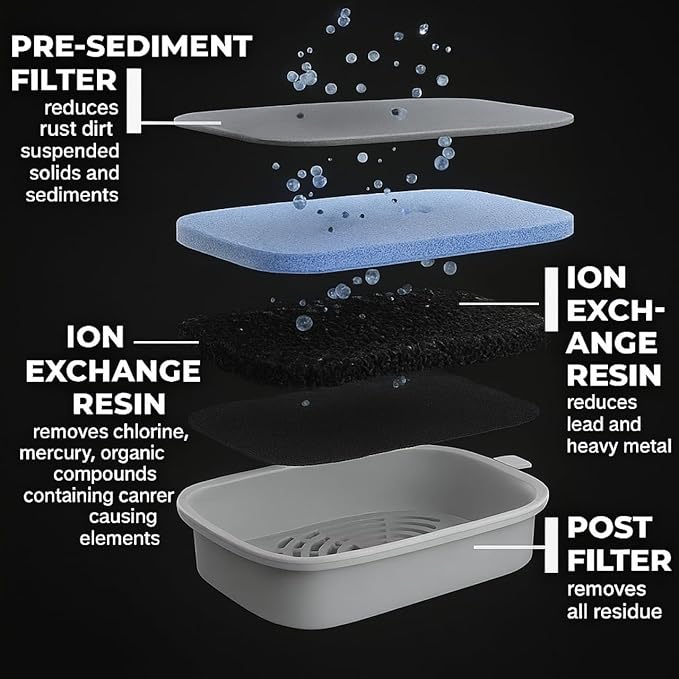 - 4 stages filtration: Re-sediment filter reduce visible dirt and sediments from the water. Ion exchange resin removes lead, heavy metail and chemical. It helps reduce the hardness of the water. Activated carbon removes chlorine, contaiminants and any odor from the water. Post filter removes any residue left in the water.