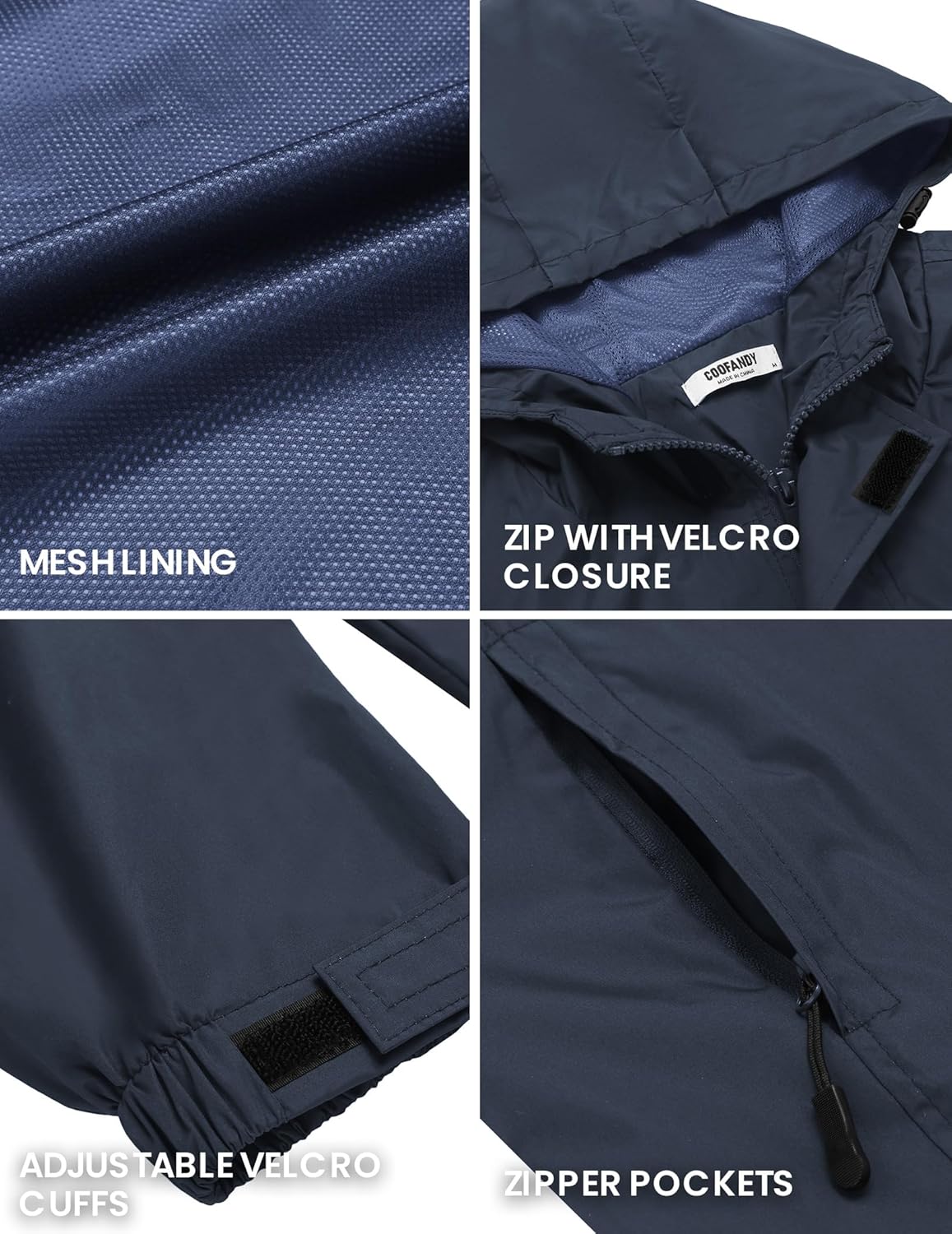• [Waterproof & Windproof] COOFANDY mens rain jacket features water-resistant fabric full heat seam-sealed construction to allows you to dry completely even during downpour rain. Hooded hiking rain coat featured 2 zipper pockets, drawcord adjustable hood and the velcro on the cuffs and zipper, hew with drawstring and breathable mesh fabric.