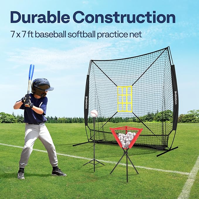 - DURABLE CONSTRUCTION - The VIVOHOME 7x7ft baseball softball practice net is built with a sturdy alloy steel frame that provides stability and strength; The tear-resistant 7-layer polyester fabric ensures long-lasting use and can withstand powerful hits; The support poles made of fiberglass effectively prevent the baseball net from sagging; 4 U-shaped ground stakes provide strong wind resistance