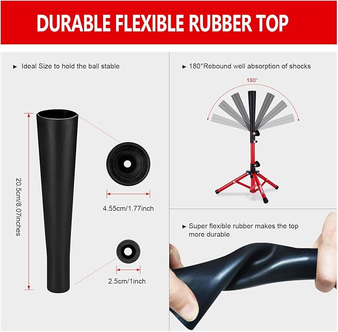 - โพ๐ฅใDURABLE-HIGH QUALITY WRAPPED RUBBERใEvery baseball batting tee's top is hand rolled, strong and durable, which is suitable for kinds of balls, with good elasticity, like baseball, softball, training ball and to have the real hitting feelings with special size design. Built with good quality rubber, the tball stand top can holds the balls stablely.