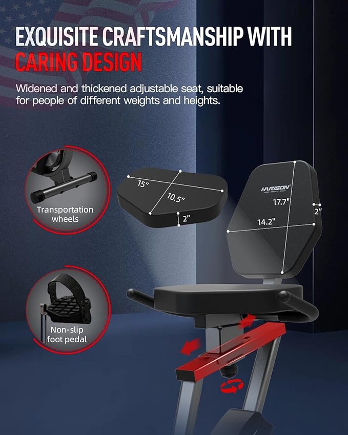- Exquisite Craftsmanship with Caring Design: Featuring extra-thickened backrest and seat cushion, HARISON magnetic recumbent bike ensures both comfort and durability, enabling fatigue-free in long-distance riding. The adjustable seat caters to the diverse needs of individuals with varying heights from 4.7''-6.2''. HARISON best recumbent exercise bike is also equipped with a water bottle holder for convenient hydration, and the transportation wheels allow you to relocate the recumbent bike effortlessly.