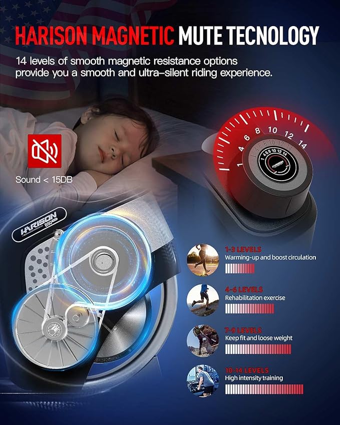 - Ultra Silent Recumbent Bike: HARISON recumbent exercise bike employs magnetic resistance technology to provide you a whisper-quiet, joint-friendly workout, eliminating any potential disturbances to your surroundings. Ideal for diverse needs 1-3 levels for warming up, 4-6 levels for rehabilitation, 7-9 levels for body shaping, 10-14 levels for muscle building.