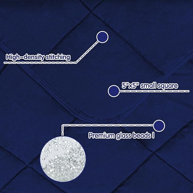 - 【TIGHTLY STITCHING&DURABILE】: Our weighted blanket composed of 5"x5" small enough compartments stitched by high-density 15000 stitches to tightly make glass beads stay put in the square all the time to bring you a more durable weighted blanket with no glass beads leakage.
