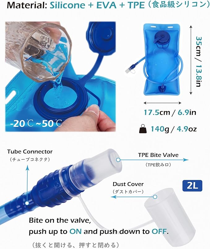 - 2-Liter Water Bladder: This 18L hydration backpack comes with a 2L water bladder, made of food-grade PEVA material, with a high-flow bite valve. The wide opening makes it easy to add ice, clean, and dry—simply flip it upside down, and it will dry on its own