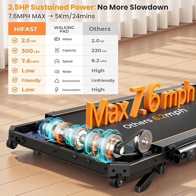 - Space-Saving Foldable Treadmills Design - Hifast small treadmills for home use the One-step folding system shrinks to 4.25"H (L47.3”×W22.6”). Fits under beds/sofas—no assembly needed. this portable treadmill with wheels moves on carpet/hardwood (46.5lbs). unbox and walk in 30 seconds for apartments & small spaces.