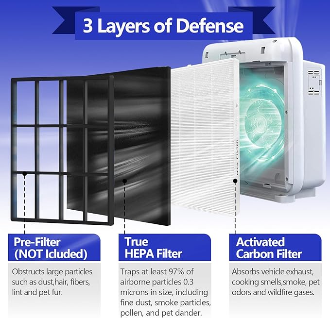 - HIGH EFFICIENCY HEPA AIR FILTER: The H13 True HEPA filter captures 99.97% of airborne particles as small as 0.3 microns, including dust, pollen, and pet dander. The air purifier filter is great for allergy sufferers and those who need extra air protection