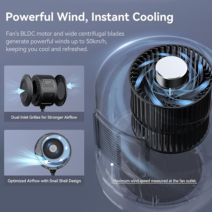 - 【Powerful Wind, Instant Cooling】The BLDC motor and wide centrifugal blades generate powerful winds up to 50km/h, keeping you cool and refreshed. (Maximum wind speed measured at the fan outlet)