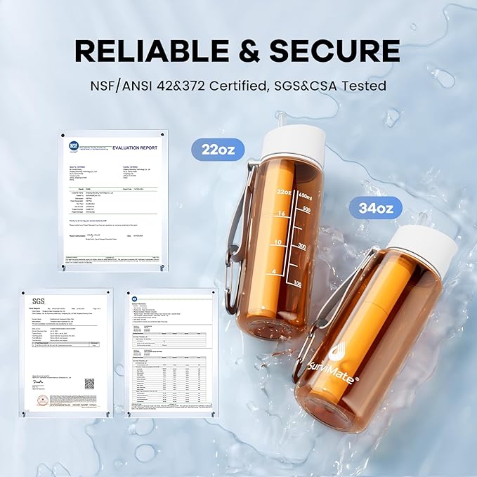 - [5-Stage Filtration] - The Survimate water filter bottle utilizes advanced composite filter technology to effectively reduce a wide range of contaminants. The filter has passed authoritative NSF/ANSI 42 certification, it employs a coarse filter screen, a 0.01μm hollow fiber UF membrane, a sediment PP membrane, purification beads, and activated carbon fiber to reduce chlorine, unpleasant odors, heavy metals, sediment, soil, organic matter, and other impurities.