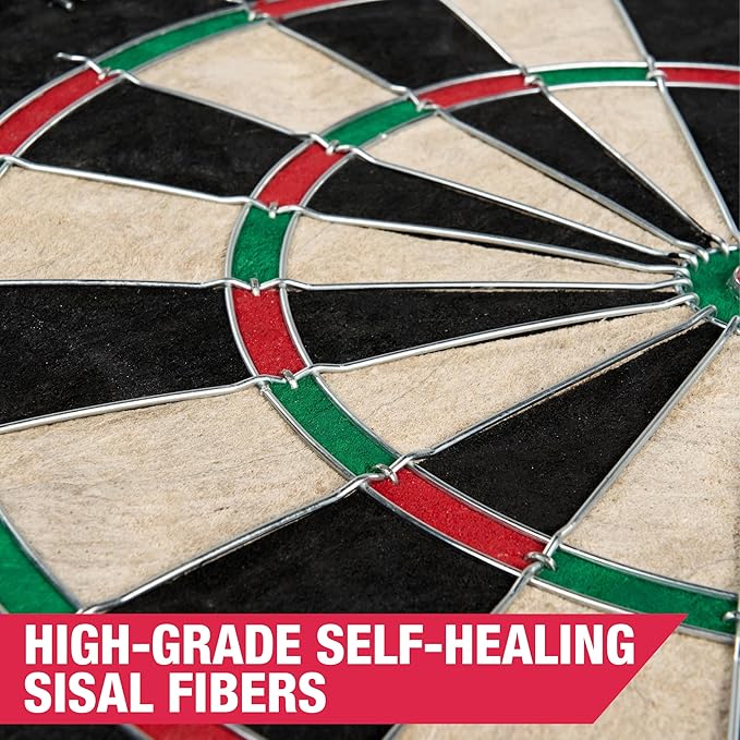 - HIGH-GRADE SELF-HEALING SISAL FIBERS: This regulation-size dartboard is 18 inches in diameter and is made with self-healing sisal fibers for good dart grip and a durable longer lifetime of play.