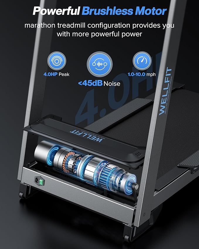 - 4HP Powerful & Quiet Brushless Motor: Brushless motor with max 4.0 HP provides efficient and low-maintenance operation. The treadmill supports up to 450 lbs and speeds from 1.0 to 10 MPH, perfect for everything from leisurely walks to intense runs, all while maintaining a under 45 dB low noise level.