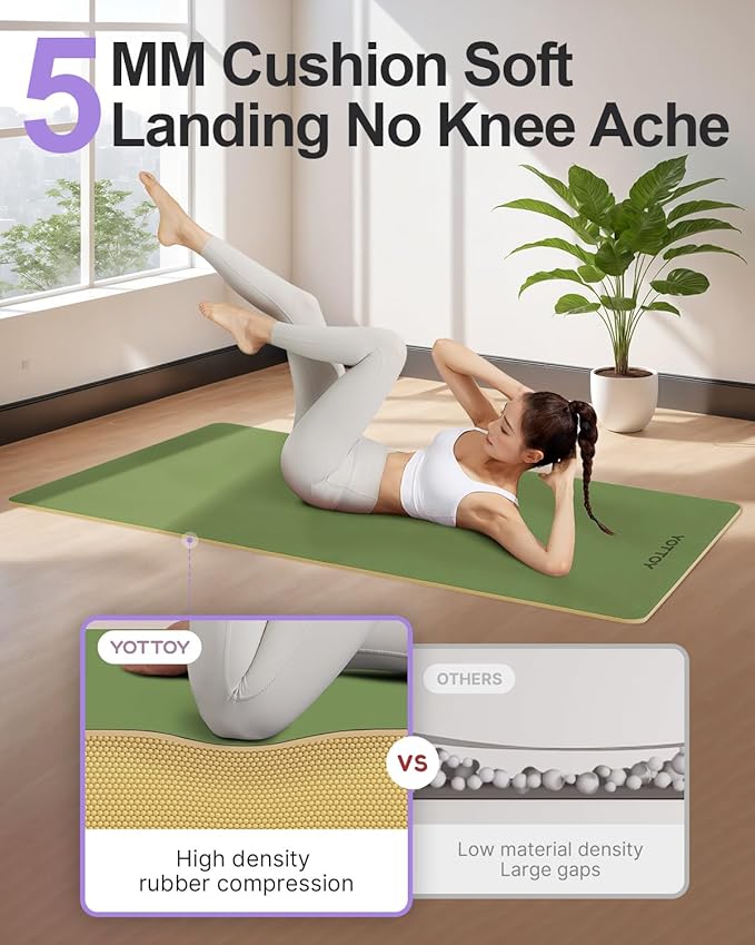 - 1.Innovative Upgraded Yoga Mat: Our YOTTOY PU Yoga Mat features a unique coconut shell material offering superior anti-slip performance. Measuring 72" x 26" x 5mm, it provides enhanced elasticity, durability, and tear resistance, making it the perfect choice for intense yoga sessions. The high-density surface ensures excellent rebound, providing a better grip and stability for your practice.