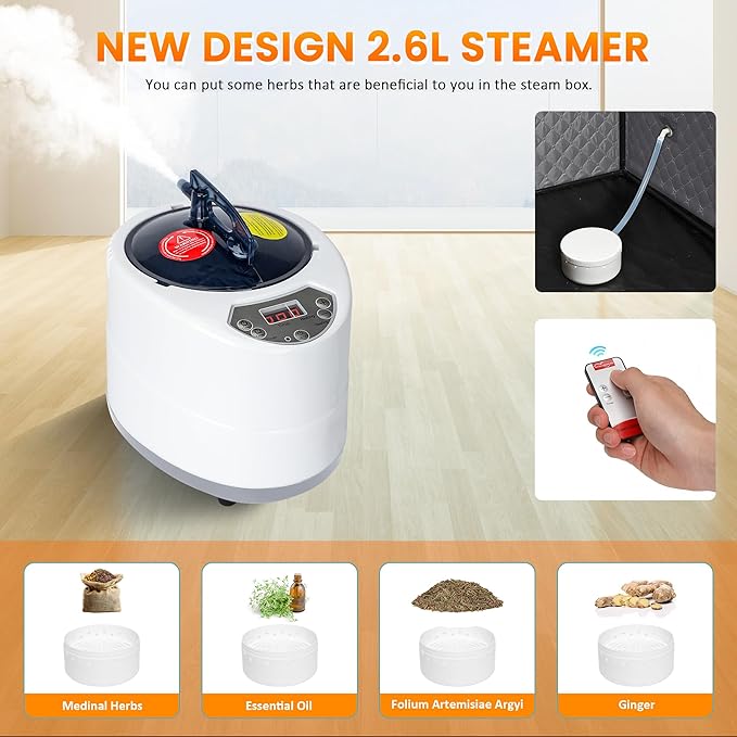 - 【Faster Heating Speed】:The portable sauna steamer has a power of 1500 W±10%,2.6L water capacity,and 9 heating levels; which can fill the entire steam tent in a short time.The improved thickened mist outlet tube increases the temperature condition and can reach the maximum temperature of 140°F/60°C in just 10 minutes;Steamer has a 1-60 minute timer with the remote control,you can adjust the heating level and time according to your needs,let you enjoy a convenient and comfortable sauna experience
