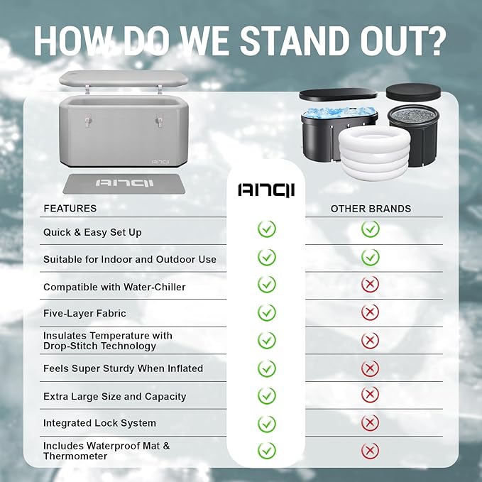 - CHILLER COMPATIBILITY: The ANQI cold plunge tub simplifies the chilling process with its smart design, featuring inlet and outlet ports for easy connection to a water chiller (not included), ensuring a consistently cold water temperature without the ongoing cost of ice. Opt for either a chiller or traditional ice to keep the conditions perfect for cold therapy. (NOTE: INLET&OUTLET SIZE IS 1/2 INCH)