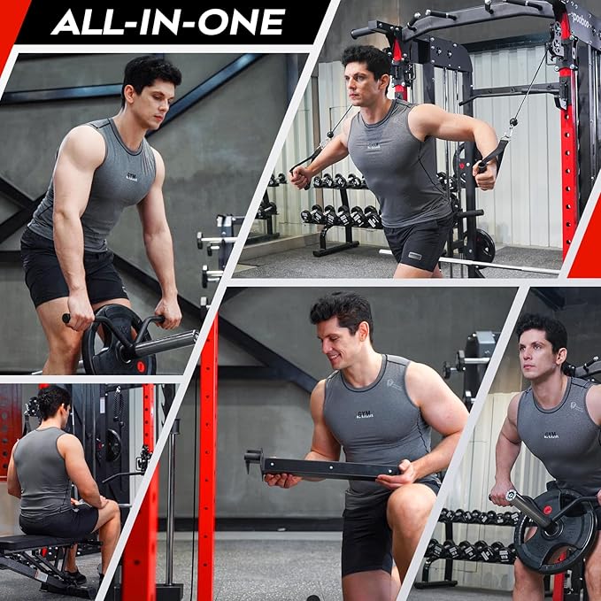 - Achieve full-body workouts at home with our versatile multi-functional gym rack and accessories: This all-in-one setup allows you to perform a variety of exercises, including Cable Flys, LAT Pulldowns, Landmine Movements, Rows, Squats, Bench Presses, Deadlifts, Bicep Curls, Tricep Extensions, Pull-ups, and Chin-ups. Enjoy a diverse workout regimen without stepping outside—reach your fitness goals and experience a complete workout from the comfort of your home!