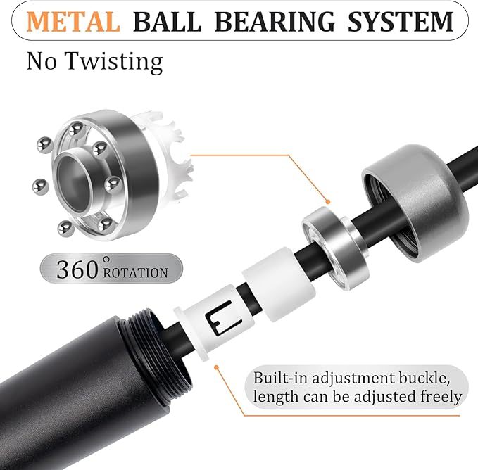 - Stable and Durable:The weighted jump rope Built-in metal ball bearing system, 360°smooth rotation, no winding or knotting,allowing you to focus on your workout without disruptions,helping you achieve your fitness goals faster and get a better workout with the same effort.