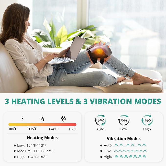 - Features 3 Heating and 3 Vibration Modes: Featuring 3 vibration settings that range from low to high intensity, the Medcursor knee massager provides a customized experience. To create the ideal relaxation for your knees, you can select from 3 calming heating levels, which are a mild 105°F, a moderate 122°F, or a warm 140°F