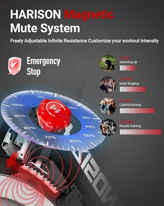 - HARISON US Mute Magnetic System: The HARISON Magnetic Silent System features an infinite resistance adjustment system that provides countless levels. Adjust the intensity of your workout to your fitness goals, providing smooth, precise adjustments and keeping your ride quiet, so you can exercise anytime without disturbing your family