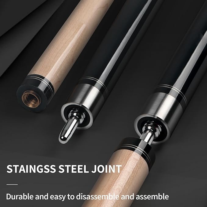 - Professional Pool Cue: Kmise 58-inch 2-piece detachable pool cue, weight 20OZ, made of high-quality Canadian hard rock maple, stainless steel joints, sturdy and durable and not easy to deform