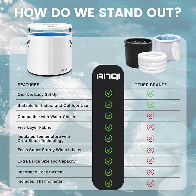 - CHILLER COMPATIBILITY: The ANQI cold plunge tub simplifies the chilling process with its smart design, featuring inlet and outlet ports for easy connection to a water chiller (not included), ensuring a consistently cold water temperature without the ongoing cost of ice. Opt for either a chiller or traditional ice to keep the conditions perfect for cold therapy.