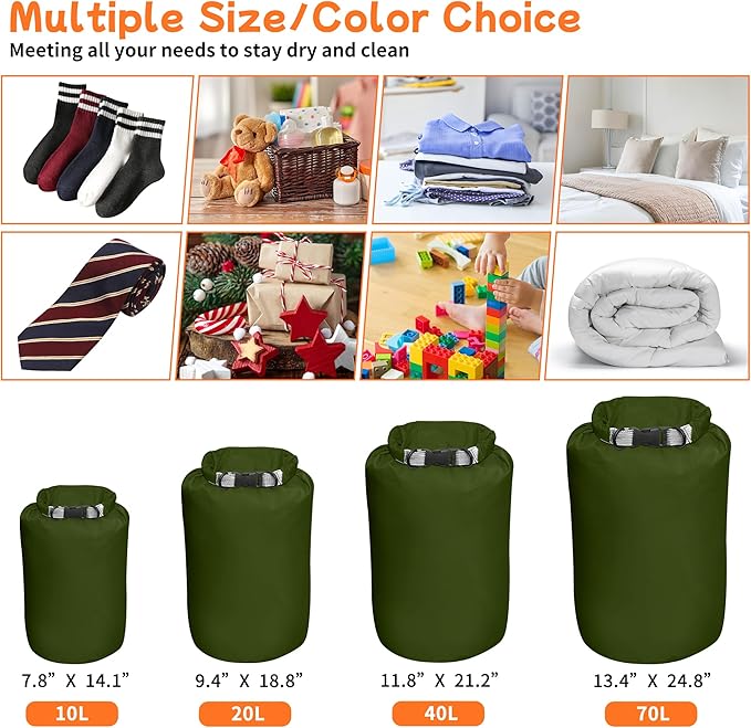 • 【Multiple Color/Size Choice】You can choose from orange, green, blue and purple. Any of the bright colors bringing you a bright mood and making your outing or storage room a beautiful scenery. We have waterproof dry sacks from small to large, ranging from 10L, 20L, 40L to 70L, meeting all your needs to stay dry and clean.