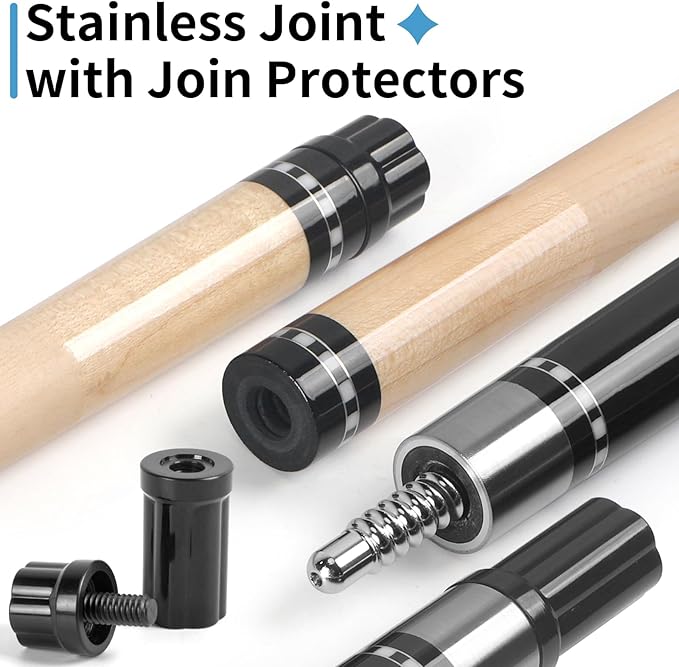 - Professional Pool Cue: Kmise 58-inch 2-piece detachable pool cue, weight 19OZ, made of high-quality Canadian hard rock maple, stainless steel joints, sturdy and durable and not easy to deform