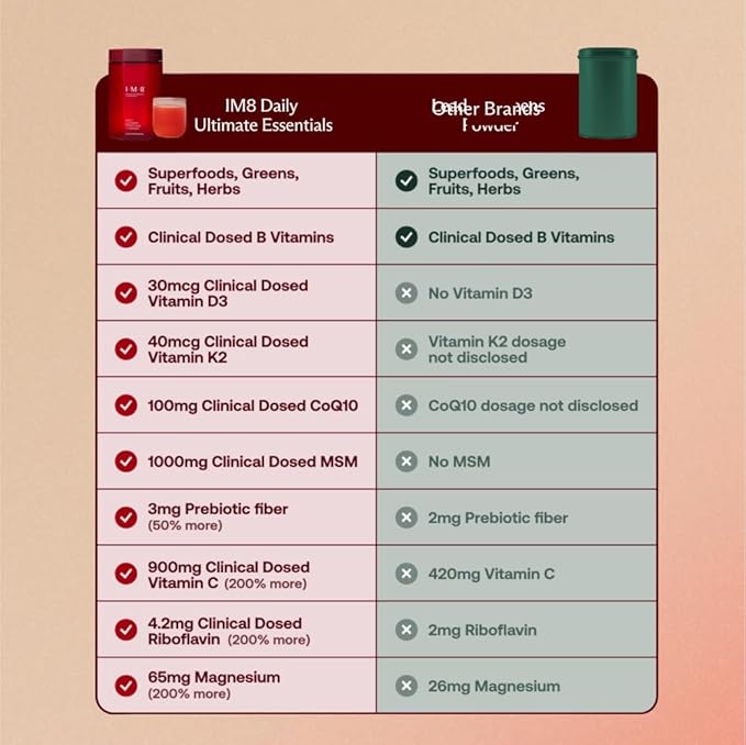 - DAILY ULTIMATE ESSENTIALS: Your daily foundation for energy, focus, digestion, and whole-body wellness support—in one delicious and easy-to-mix drink. IM8 Daily Ultimate Essentials is a science-backed, all-in-one supplement for men and women designed to simplify daily nutrition with a science-backed formula. With 92 nutrient-rich ingredients, including essential vitamins, minerals, superfoods, and clinically studied doses of CoQ10 and MSM, IM8 supports hydration, digestion, energy metabolism, immune function, and overall well-being, including key nutrients for hair, skin, nails, joints, muscles, and heart health.