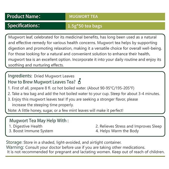 - [Support Immune Health]: Mugwort tea is gentle and beneficial for all ages, rich in minerals and vitamins. It helps relax the body and is traditionally enjoyed as a comforting tea for women during their cycle, providing soothing support for overall well-being.