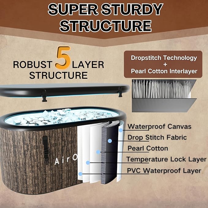- DURABLE MULTI-LAYER METERIAL:Our Inflatable Cold Plunge Tub features a robust drop-stitch construction, 5-layer insulation material is waterproof, tear-resistant, and comfortable, ensuring the ice bath tub won't crack or warp. It maintains optimal temperatures from -5°F to 140°F, perfect for post-training ice and hot water therapy.