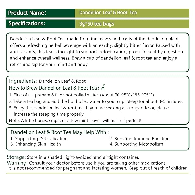 - [Wellness Tea]: Sourced from nutrient-rich soil, our dandelion leaf and root tea is made with hand-picked botanicals, free from artificial additives or chemicals. Each tea bag is expertly crafted to offer a flavorful and beneficial experience with every brew.