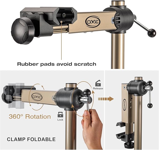 - 【Universal Convenience】: Able to support bikes up to 30 kg with tubes ranging from 20-50 mm, this bicycle stand will hold your road or mountain bikes with stability and ease. Thanks to a 39"-62" adjustable height and 360-degree rotating clamp, you'll be able to get to work while standing up or sitting down, and don’t need to bend over backwards, causing aches and strains
