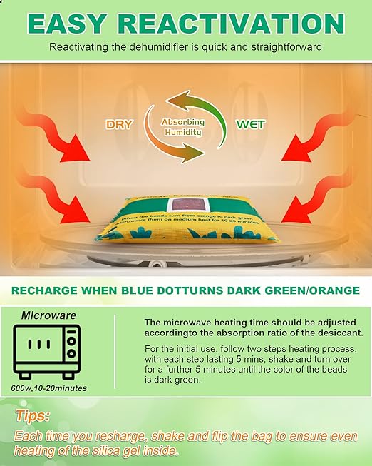 - Fast and Easy Reactivation: Recharging your moisture absorber bags is quick and simple! Just place the bags in the microwave for up to 5 minutes on each side, repeating the process until the beads return to their original orange color. For best results, use low microwave heat (levels 1-3) to ensure safe reactivation and avoid damaging the transparent window. The reactivation time may vary depending on the moisture level and bead condition