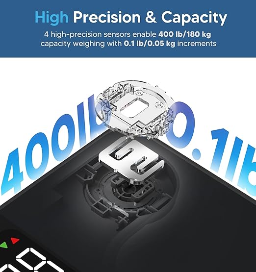 - Precision Measurement & Safety Design: Our scale body weight delivers 0.1 lb/0.05 kg accuracy and supports weights up to 400 lb/180 kg, ensuring consistent results across all body measurements. Complementing its technical performance, the 5mm tempered glass platform and anti-slip textured surface provide enhanced stability and safety for users of all ages and fitness levels, from adults to athletes