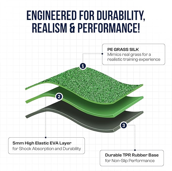 - Built to Last – Anti-Slip EVA Base & Tear-Resistant Turf for Daily Use Engineered with a 5mm EVA foam base and textured TPR backing for grip on grass, carpet, or concrete. Top turf layer uses high-quality PE synthetic grass built to handle daily swings. Reduces shock, prevents sliding, and protects floors and clubs. Designed for long-term training with all golf clubs.