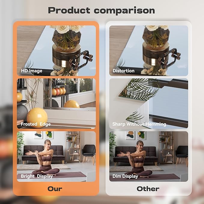 - ๐ฅ[Explosion-proof]-It can withstand impact better than ordinary glass, which improves the shatterproof performance of the product; this home gym mirror uses shock-proof film and anti-scattering function, even if it is hit by external force, broken glass will not splash, and it will not cause harm to you by preventing the glass from falling.