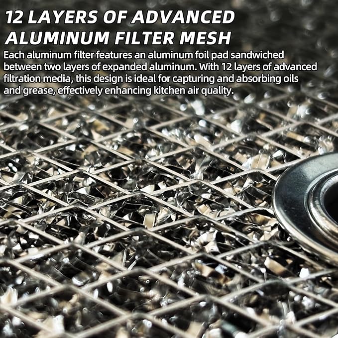 - 12 Layers of Advanced Aluminum Filter Mesh: Each range hood filter features an aluminum foil pad sandwiched between two layers of expanded aluminum. With 12 layers of advanced filtration media, this design is ideal for capturing and absorbing oils and grease, effectively enhancing kitchen air quality